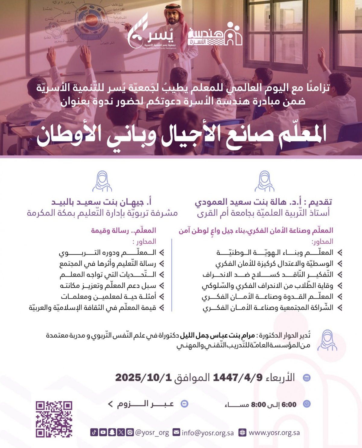 تزامنًا مع اليوم العالمي للمعلم يطيبُ لـ جمعية يسر للتنمية الأسرية دعوتكم لحضور ندوة ضمن مبادرة هندسة الأسرة بعنوان: "المعلم.. صانع الأجيال وباني الأوطان" "المعلّم وصناعة الأمان الفكري: بناء جيل واعٍ لوطن آمن" تقديم: أ.د. هالة بنت سعيد العمودي "المعلم.. رسالة وقيمة" تقديم: أ. جيهان بنت سعيد بالبيد تُدير الحوار: د. مرام بنت عباس جمل الليل الأربعاء ٩ ربيع الثّاني ١٤٤٧هـ الموافق- ١ أكتوبر ٢٠٢٥ م ٦:٠٠ - ٨:٠٠ مساءً. رابط الزوم: